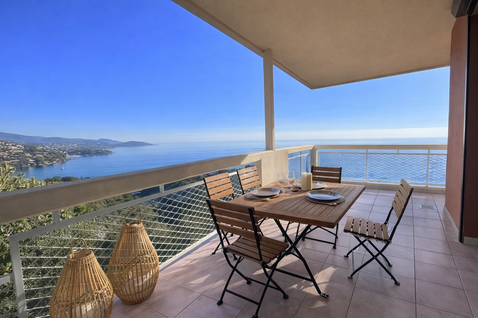 - Terrasse : grande terrasse en angle, vue mer panoramique, salon de jardin, table et 4 chaises
