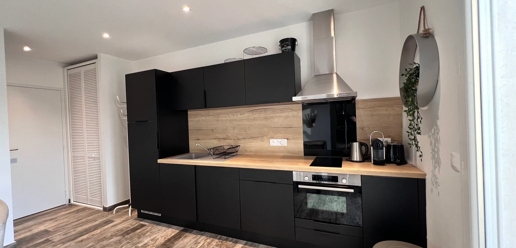 –Cuisine équipée avec four traditionnel, lave-linge, grand réfrigérateur-congélateur , plaques à induction, hotte, grille-pain, cafetière, bouilloire.