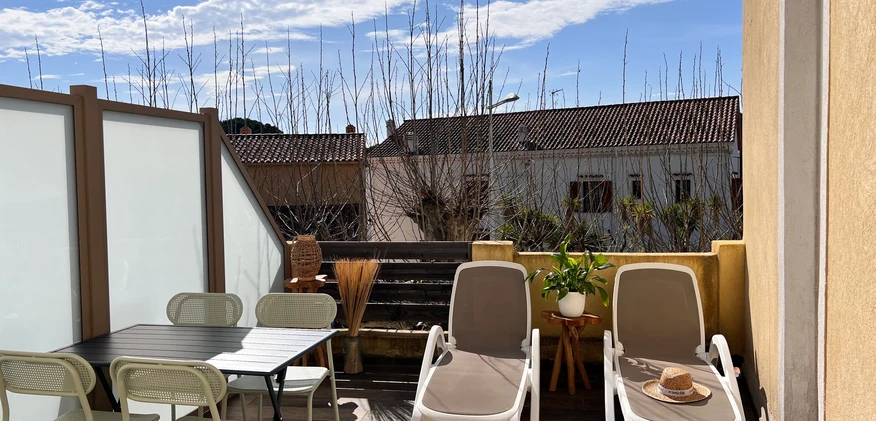 –Terrasse 10m² avec salon de jardin et bain de soleil